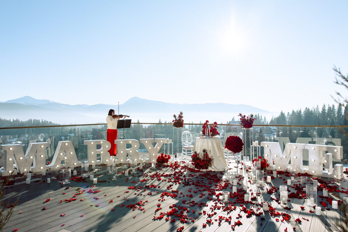 Тераса з виглядом на гори, ніжне оформлення квітами та свічками, розкішна арка у формі серця, – хіба це не ідеальний варіант для романтичного освідчення в Буковелі?