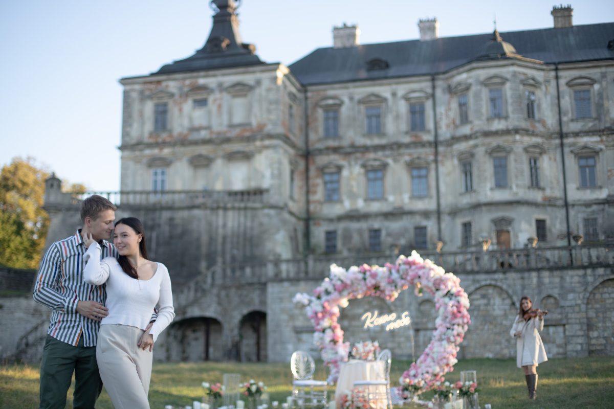 Гуляючи поблизу Підгорецького замку, закохані натрапили на романтичну вечерю. Локацію прикрашала велика кількість ліхтарів та пелюсток троянд, а біля столика очікував величезний букет троянд.