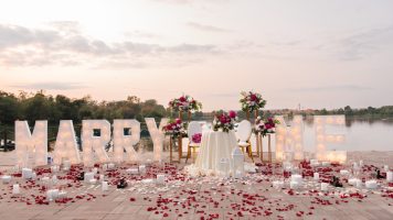Об’ємне оформлення свічками та пелюстками троянд.