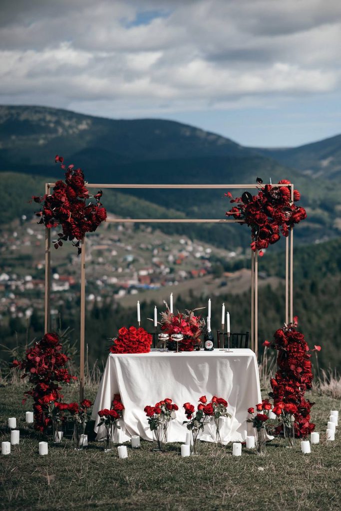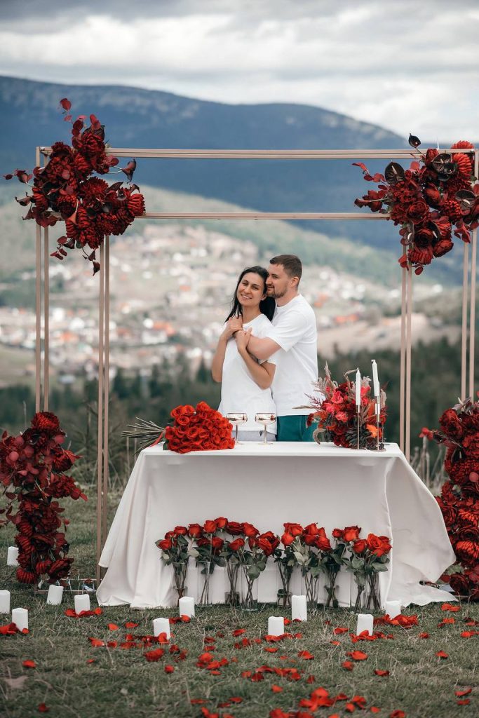 Ми обрали галявину з неймовірними краєвидами та красиво її оформили. Повсюди мерехтіли свічки, а живі квіти додали особливої святкової атмосфери.
