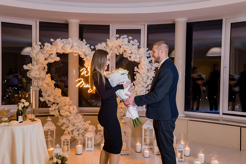 - Арка у вигляді серця з квітковим оформленням декоративними квітами та лед надписом “Will you marry me?” або обʼємні літери «LOVE» з підсвіткою (на вибір)