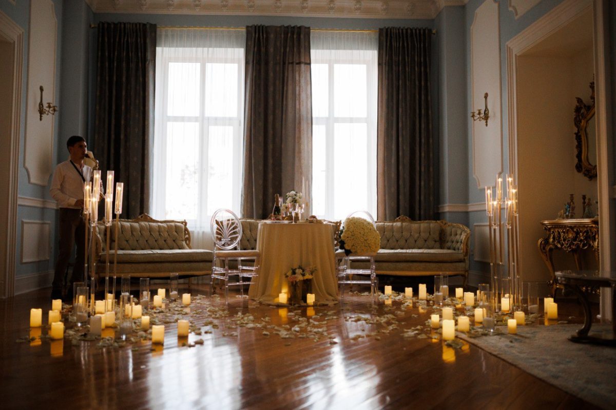 Інтер’єри маєтку захоплюють витонченою розкішшю: від класичних залів до камерних кімнат з історичними меблями. Ви зможете вибрати ідеальне місце для освідчення – на фоні камінної зали, під аркою з квітів у саду на території маєтку.