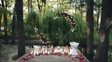 Об’ємне оформлення свічками та пелюстками троянд.
