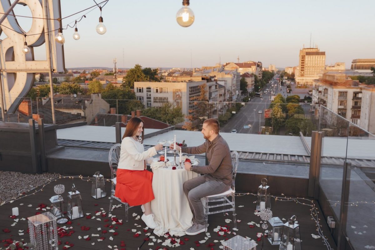 Тераса з неймовірним виглядом на місто це ідеальна локація для вашого освідчення. Ми прикрасимо терасу великою кількістю декорацій, ліхтарів та свічок. Пелюстки троянд зроблять атмосферу по-особливому романтичною.