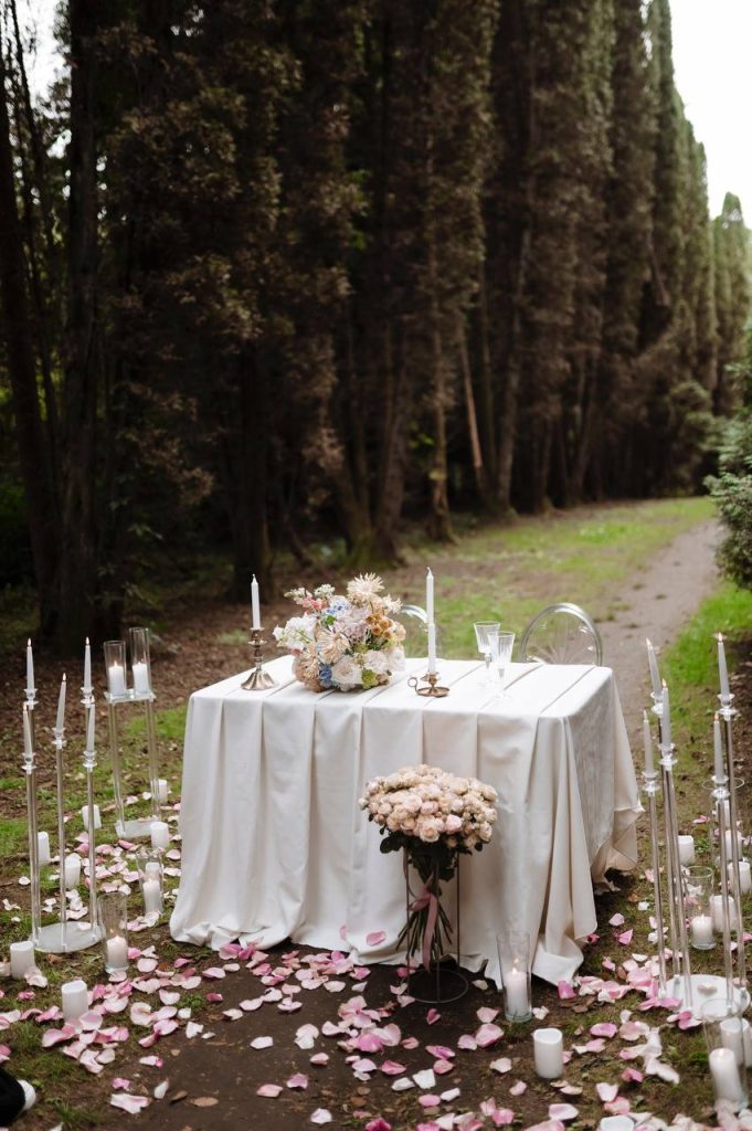 Ми оформимо локацію зі смаком та зробимо акцент на квітах і свічках. Композиції з троянд та пелюстки будуть розсипані по доріжці, що вестиме до сервірованого столу.