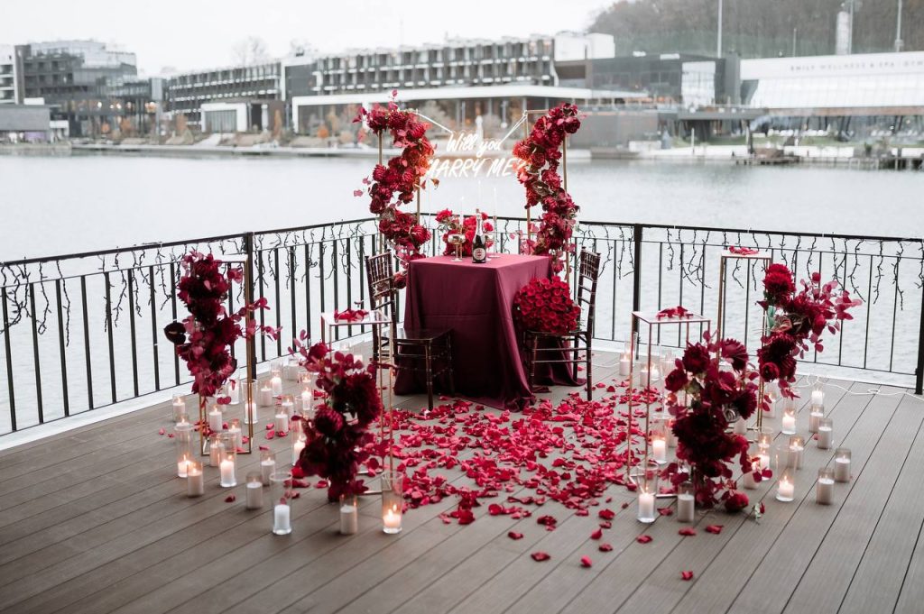На Вас чекатиме розкішне освідчення на терасі в Emily resort. Локація буде романтично задекорована свічками, декораціями, пелюстками троянд та живими квітами. Дуже ефектно буде виглядати арка у формі серця, оформлена декоративними квітами та написом Will you marry me?