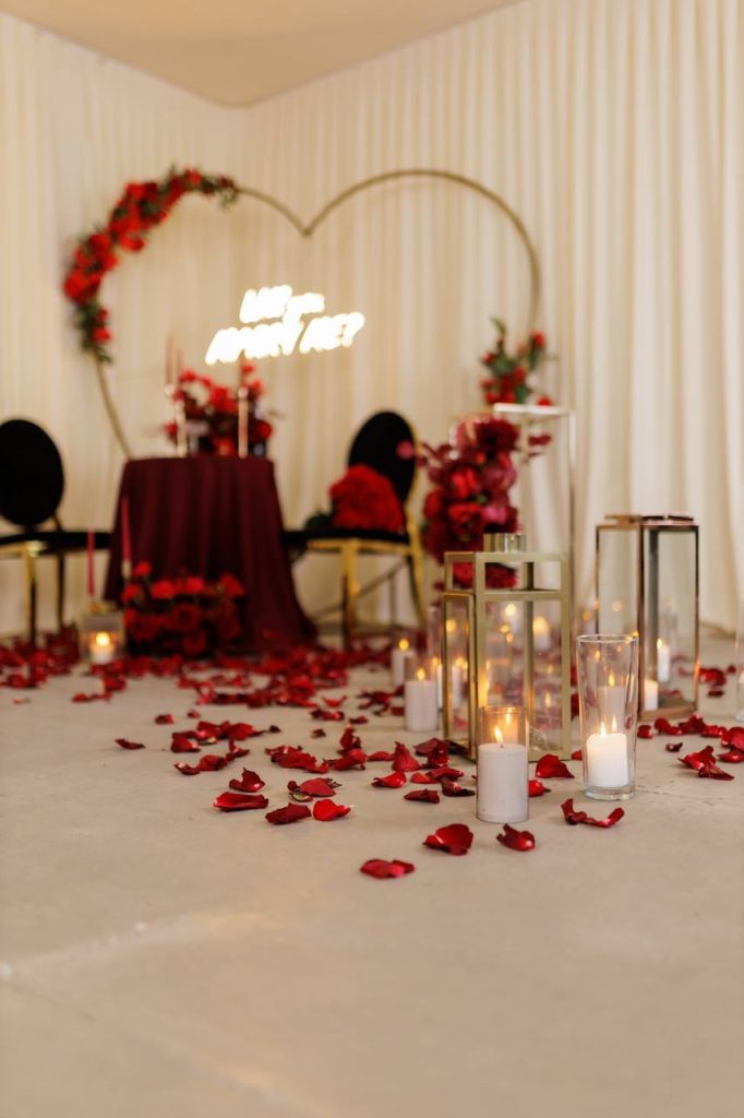 Посеред зали з панорамними вікнами красуватиметься задекорований столик. Локацію ми оформимо великою кількістю ліхтарів, декорацій, свічок та пелюсток троянд.