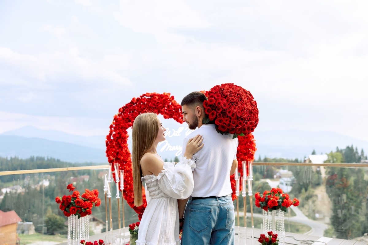 Тераса з виглядом на гори, ніжне оформлення квітами та свічками, розкішна арка у формі серця, – хіба це не ідеальний варіант для романтичного освідчення в Буковелі?